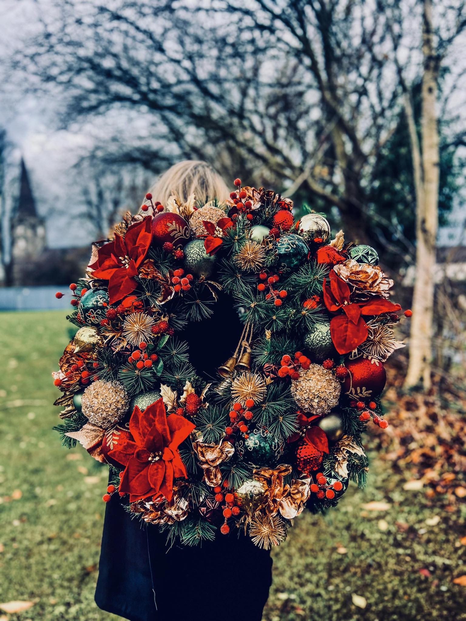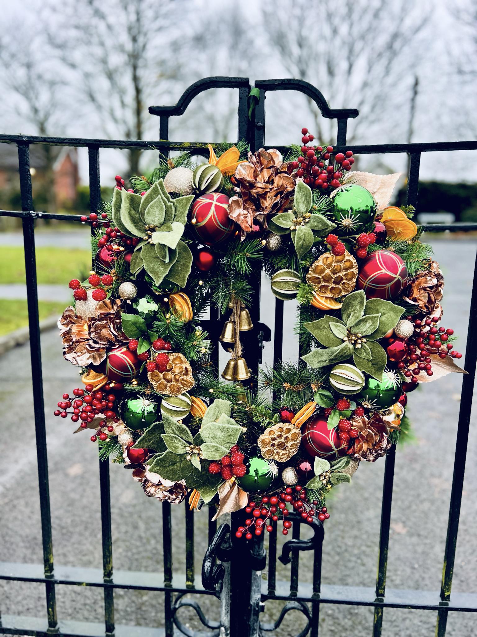 Pre-order Only - Bespoke Christmas wreath made with baubles and faux flowers in traditional Christmas tones like golds, reds and greens.